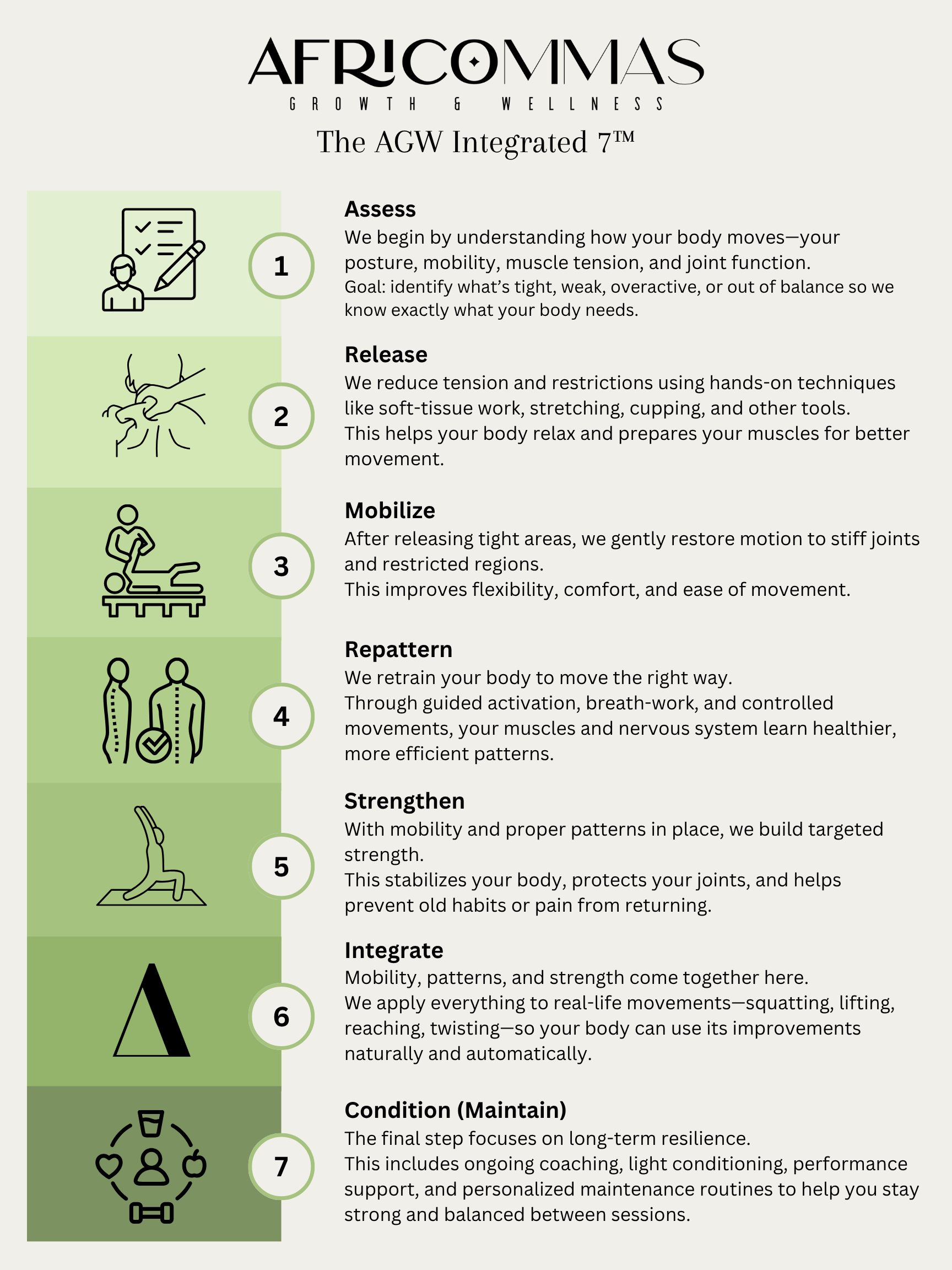 Integrated wellness is all about nurturing the whole person—body, mind, and spirit. Unlike conventional wellness practices that often focus on treating specific symptoms or ailments, integrated wellness seeks to create balance and harmony in all areas of life. At AGW, we use a blend of yoga, mind-body medicine, breath and bodywork, and corrective exercise to help you achieve overall well-being. It's not just about feeling better; it's about thriving in every aspect of your life.